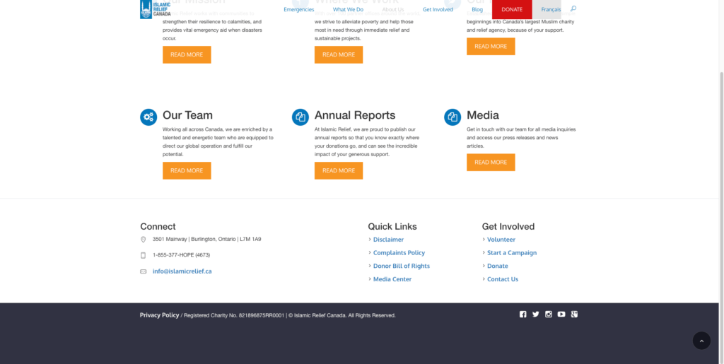 Islamic Relief Canada included their contact information very thoroughly in their footer and they appear in top SEO results for ‘charities in Canada’.