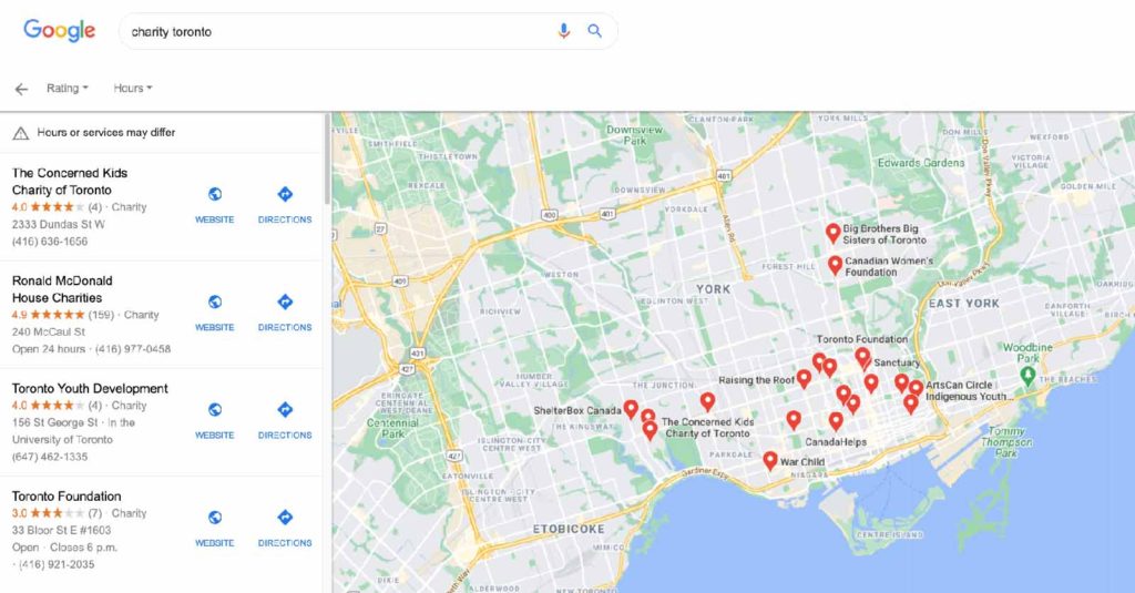 Check out some of these charities showing up on Google Maps when you search ‘charity Toronto’. You want to also be in those results! What do you find when you search your charity subject matter?