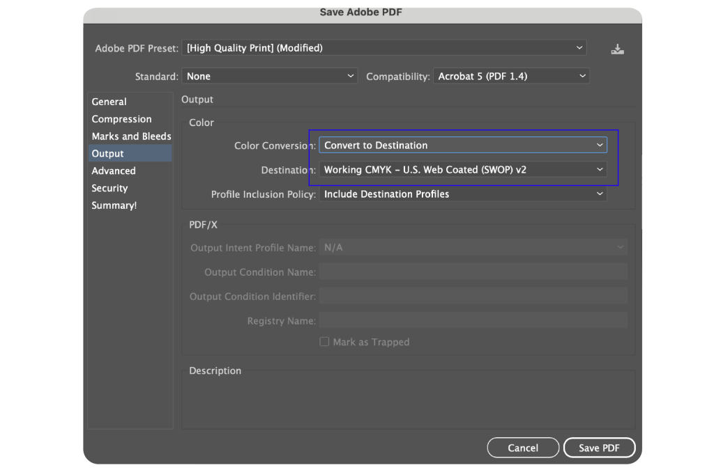 Third, go to Output and Select Color Conversion drop down and Convert To Destination selecting Working CMYK – U.S. Web Coated (SWOP) v2. This is helpful as it ensures all the colour will be in CMYK ready for print.