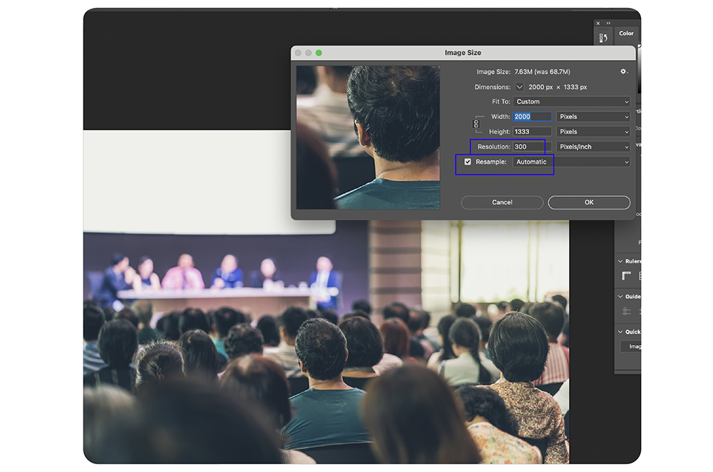 If you don’t have a large enough image for your design, there is a work-around using Photoshop’s Image Size tool. This handy tool allows you to resample the image to fit your design without sacrificing too much quality. Go to Image -> Image Size, enter the new image size dimensions you need in width and height, and set the resolution to 300 PPI (Pixels/Inch), and checking the Resample options to help maintain image sharpness. Often times, the Automatic option for Resample should work but try all the other Resample options to see what works best for your image.