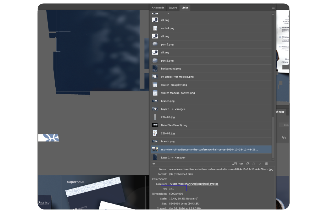 Always use high-resolution images for print design. Before adding in new images, check the properties of an image first including image size (e.g. 2832 × 2832) and PPI (e.g. 75, 200, or 300 PPI) by right clicking on it and selecting Properties or Get Info.