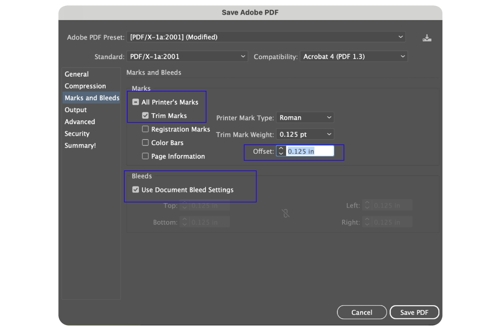 Second, go to Marks & Bleeds and check off Trim Marks and change the offset to .125in. Also check off Use Document Bleed Settings. These options will give your printer guidelines for where to cut the paper in your file.
