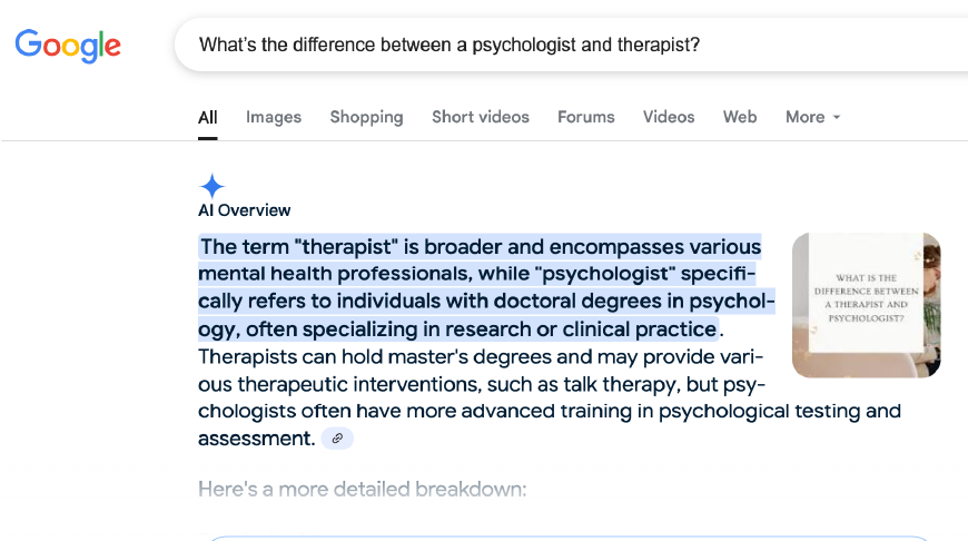 Generic blog posts like “What is high-functioning anxiety?” or “How to cope with holiday stress” are summarized by AI Overview, reducing clicks. Instead, produce niche content that doesn’t exist elsewhere. Ask yourself: can ChatGPT answer this question, if so, it is likely not the best blog topic. For example, a therapist could write “How Therapy Supports Entrepreneurs with Social Anxiety in Toronto” or “Mindfulness Techniques for Students with Test Anxiety in Calgary.” Use tools like SEMrush or Google Trends to identify low-competition topics. This ensures your content fills gaps AI can’t address, making your site a go-to resource for specialized health and wellness information, attracting organic traffic from users seeking specific solutions.