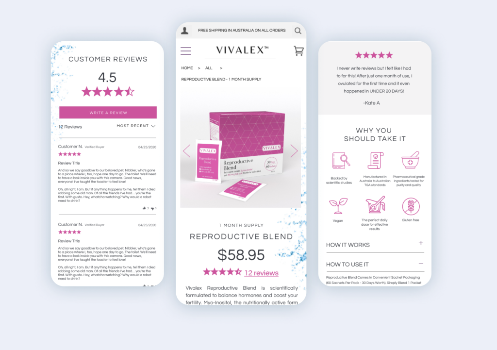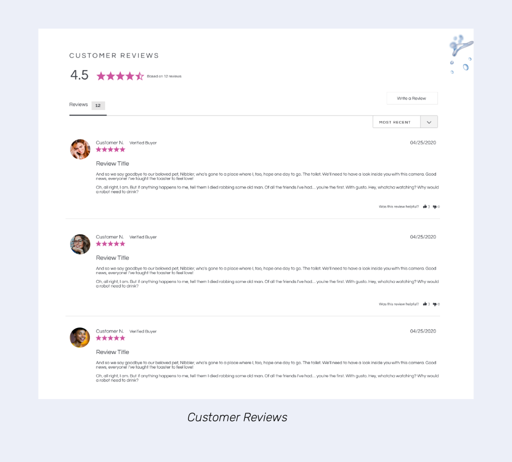 Consider including photos of real customers and their purchased products to lend more reliability and credibility to their reviews. And if you have Google Reviews, great! You can even add Google Reviews to your product pages very easily.