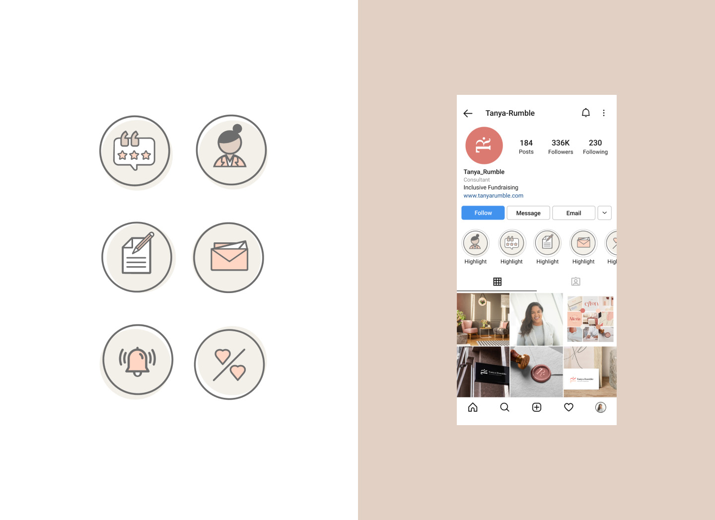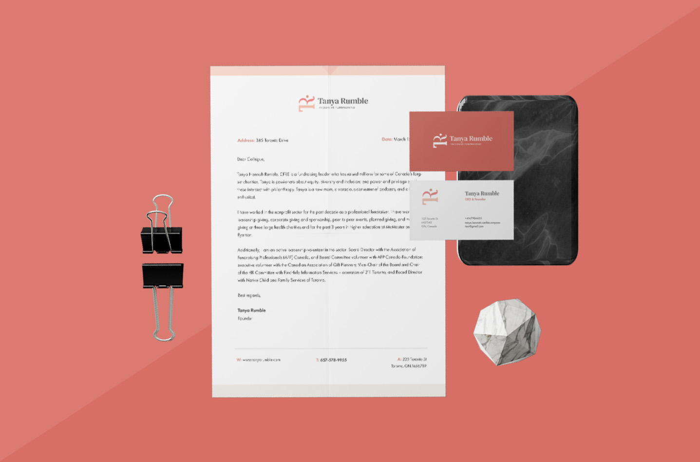 Tanya Rumble is a speaker, writer, coach and consultant who helps non-profits with fundraising and inclusion. She wanted a brand that represented her personal taste, and her lifestyle but also spoke to her clientele – females non-profit professionals in senior executive roles. Tanya required a new brand from scratch. We worked with Tanya to create her new logo, fonts, icons, and more. In the end, she received a style guide to apply to all her company’s new branding.